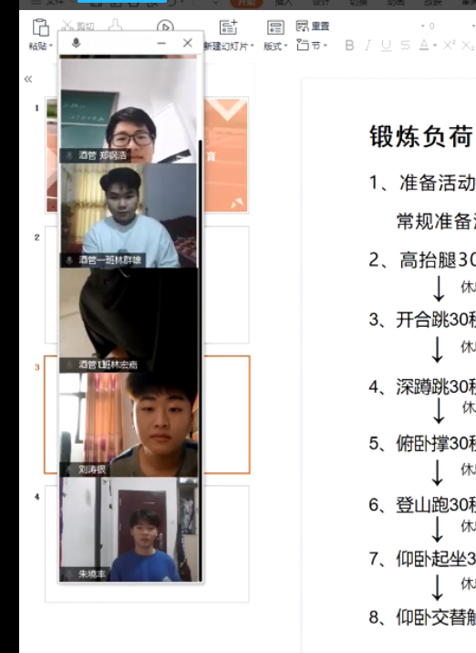 公共教学部刘太全老师主讲《大学体育》课程。克服体育课需要固定场地、教学器材、动作示范的困难。他将适合线上教学的太极拳和多种身体素质训练等教学内容融合到课件中,同时使用“视频点名”发布签到、分享学习图片及视频、线上互动、学生提交线下训练图片或视频作业等多种方式,保证学生按要求练习,有效地监控学生学习。