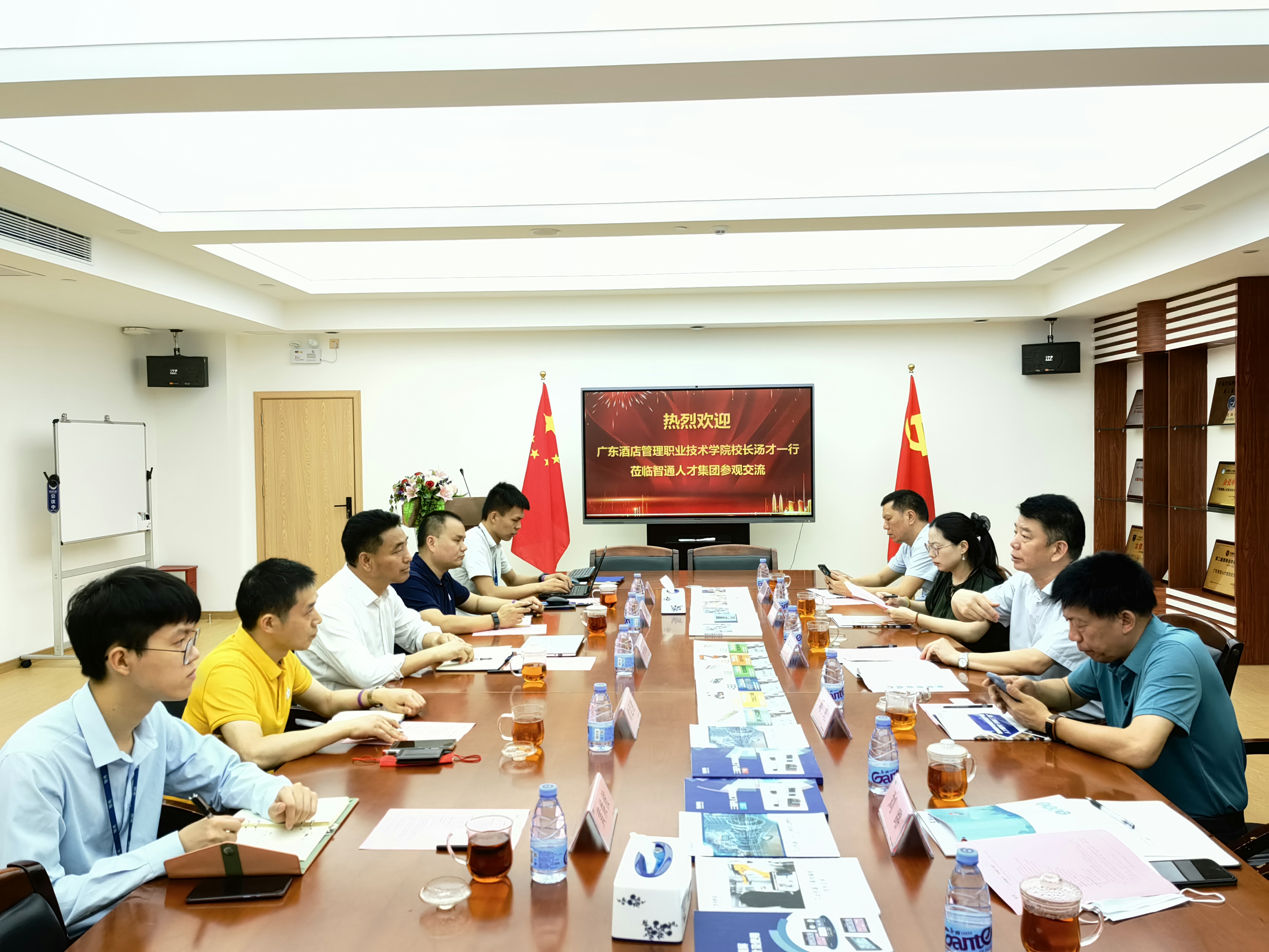 近日,广东酒店管理职业技术学院校长汤才、副校长葛虹亲自带领学校相关单位负责人,应邀赴智通人才集团参观调研。智通人才集团总裁李纲领及项目公司主要领导热情接待。