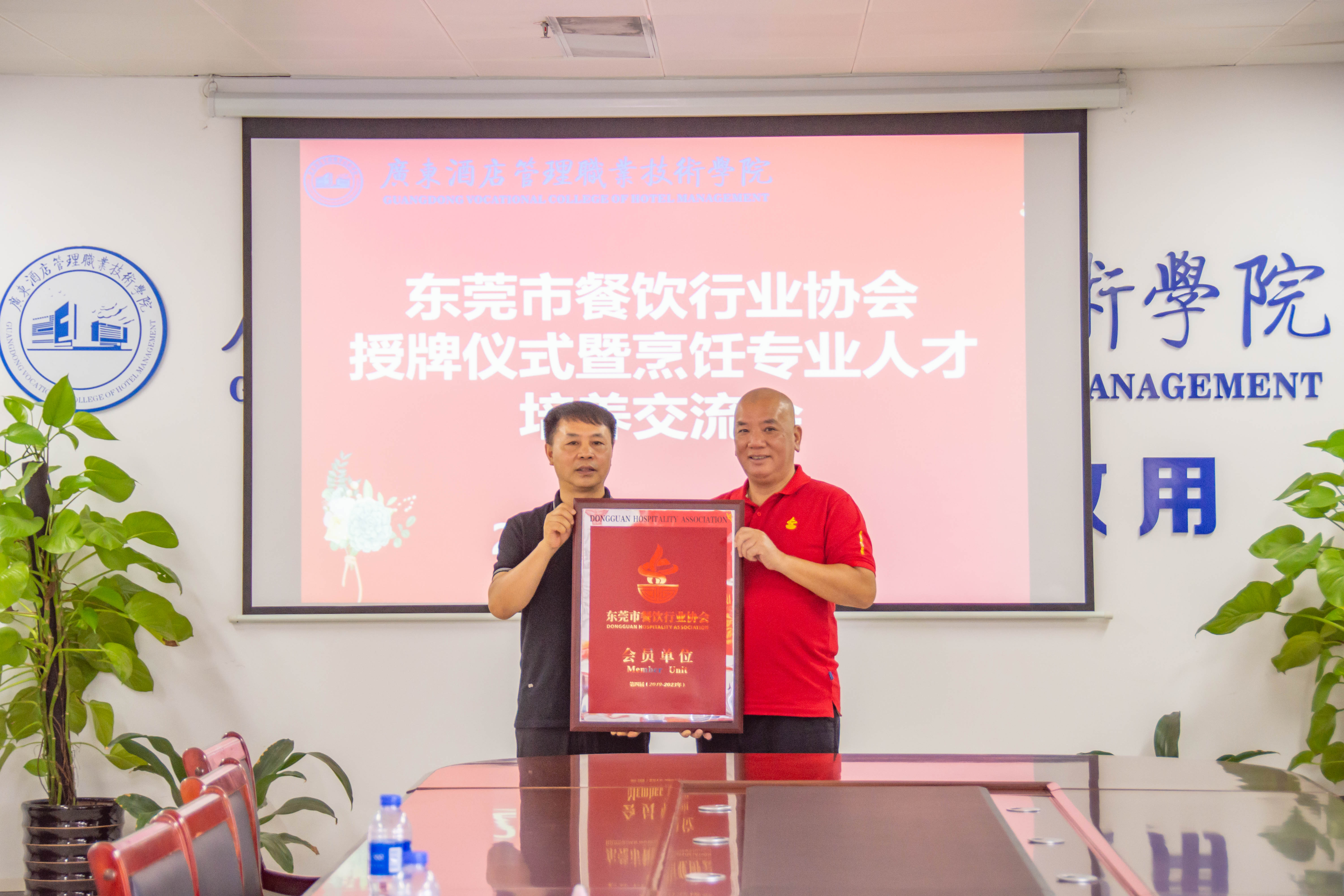 东莞市餐饮行业协会王志良会长向广东酒店管理学院副校长张天阳授牌