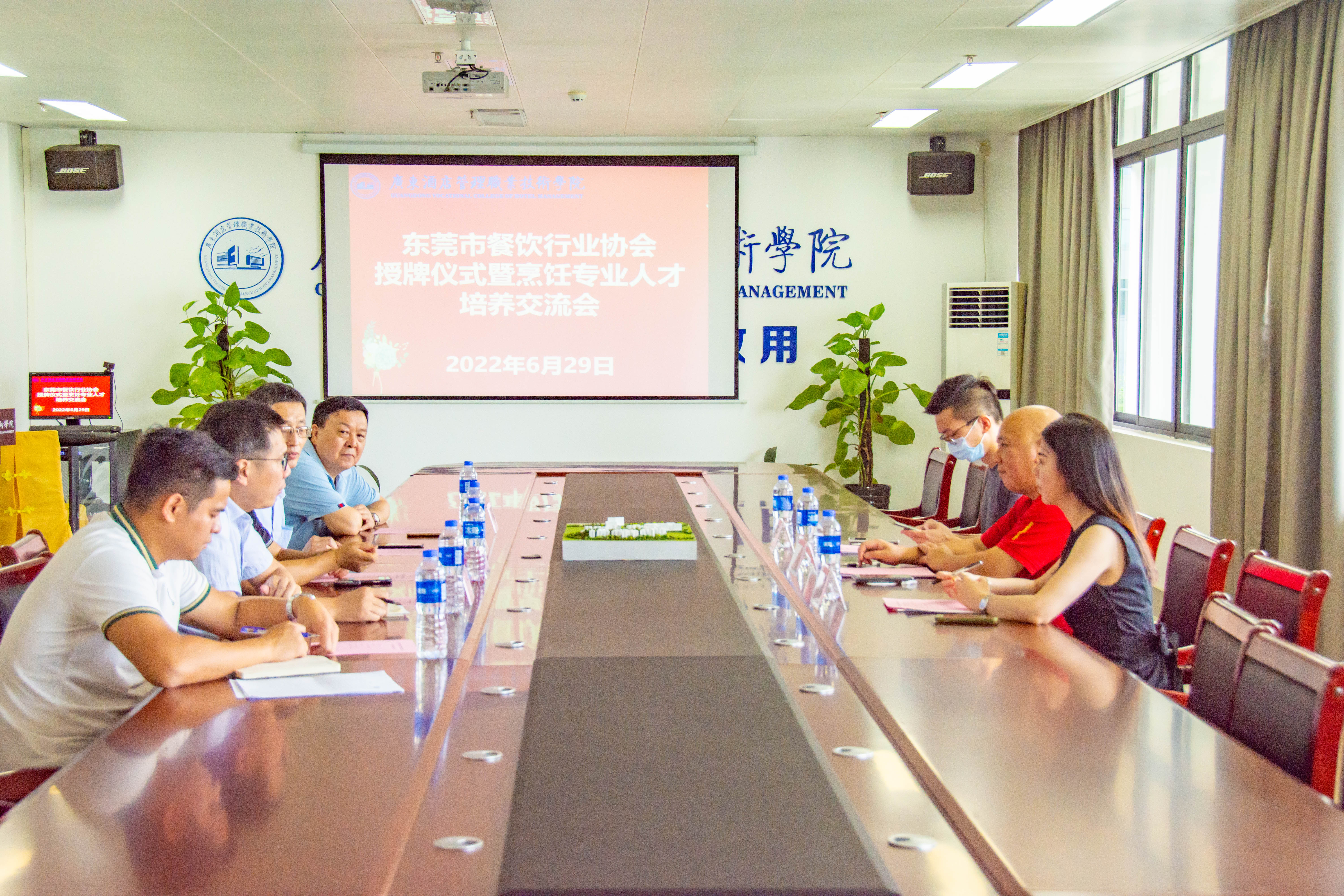 2022年6月29日,东莞市餐饮行业协会会长王志良、秘书长翟韵诗、会员部主任梁兆聪莅临广酒学院出席东莞市餐饮行业协会授牌仪式暨烹饪专业人才培养交流会。广酒学院副校长张天阳、教务处处长胡克静、餐饮与粤菜学院院长陶兴无、校企合作办公室叶汉琪及相关教师代表参加了授牌仪式。活动由陶兴无院长主持。