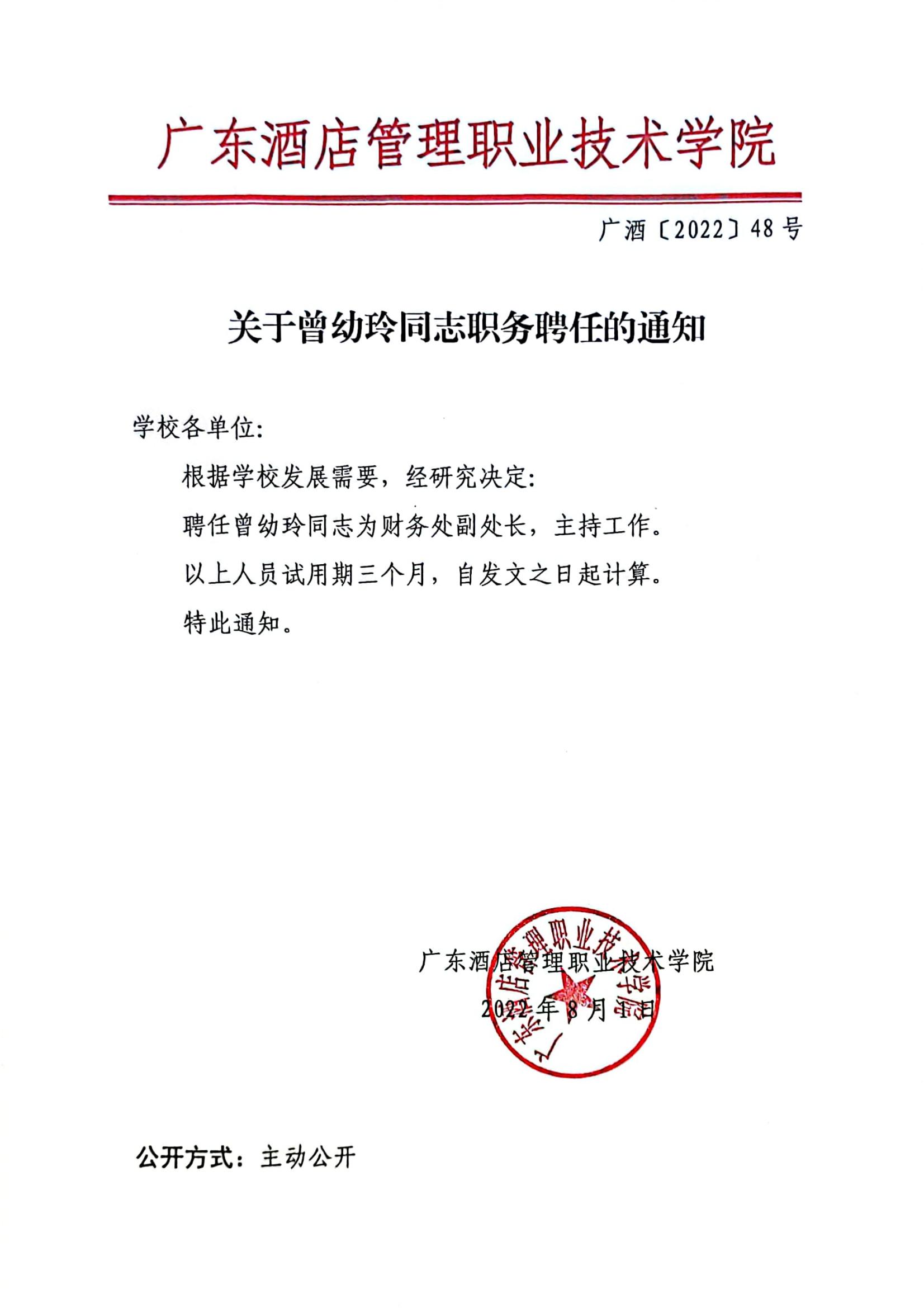 关于曾幼玲同志职务聘任的通知
