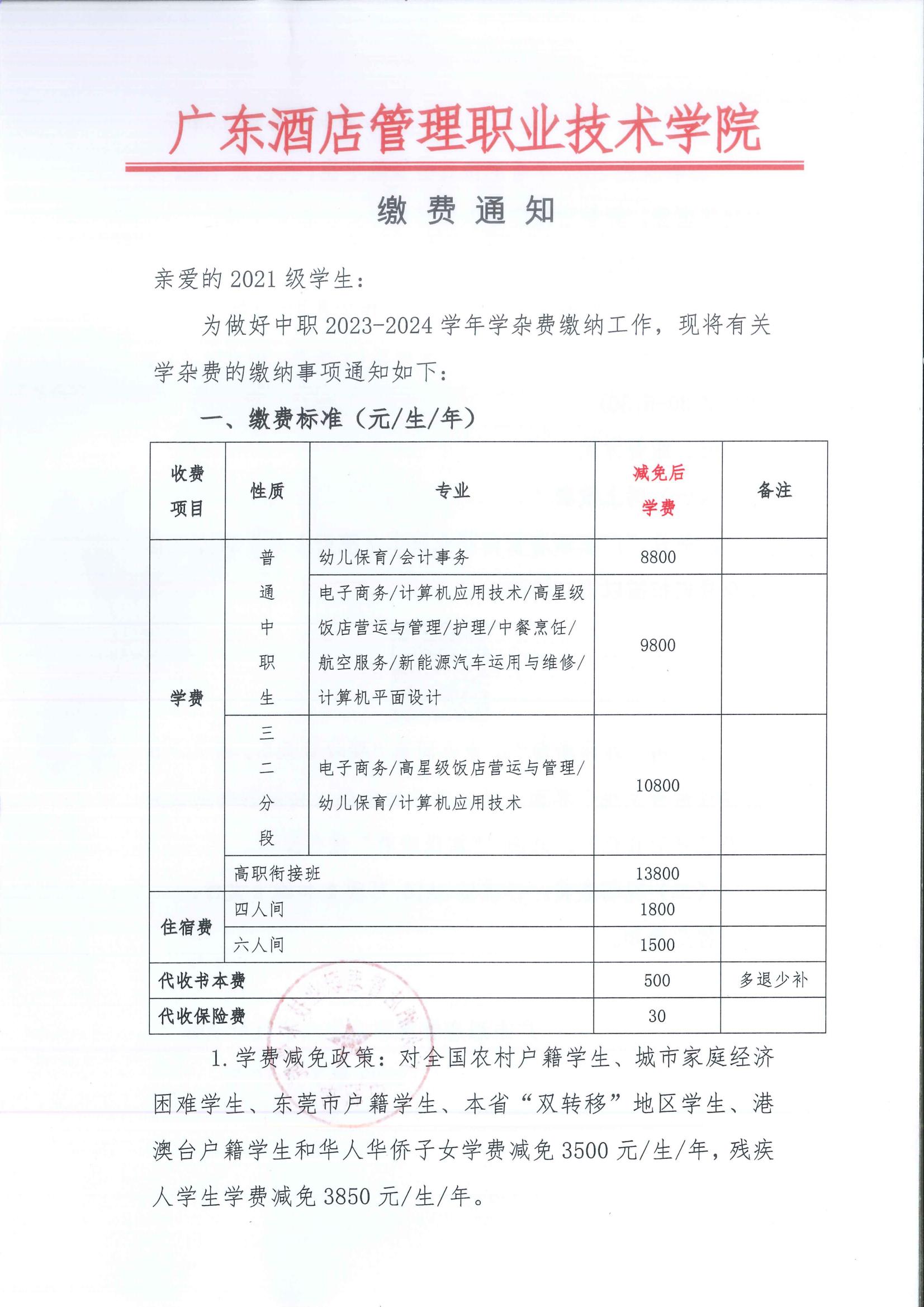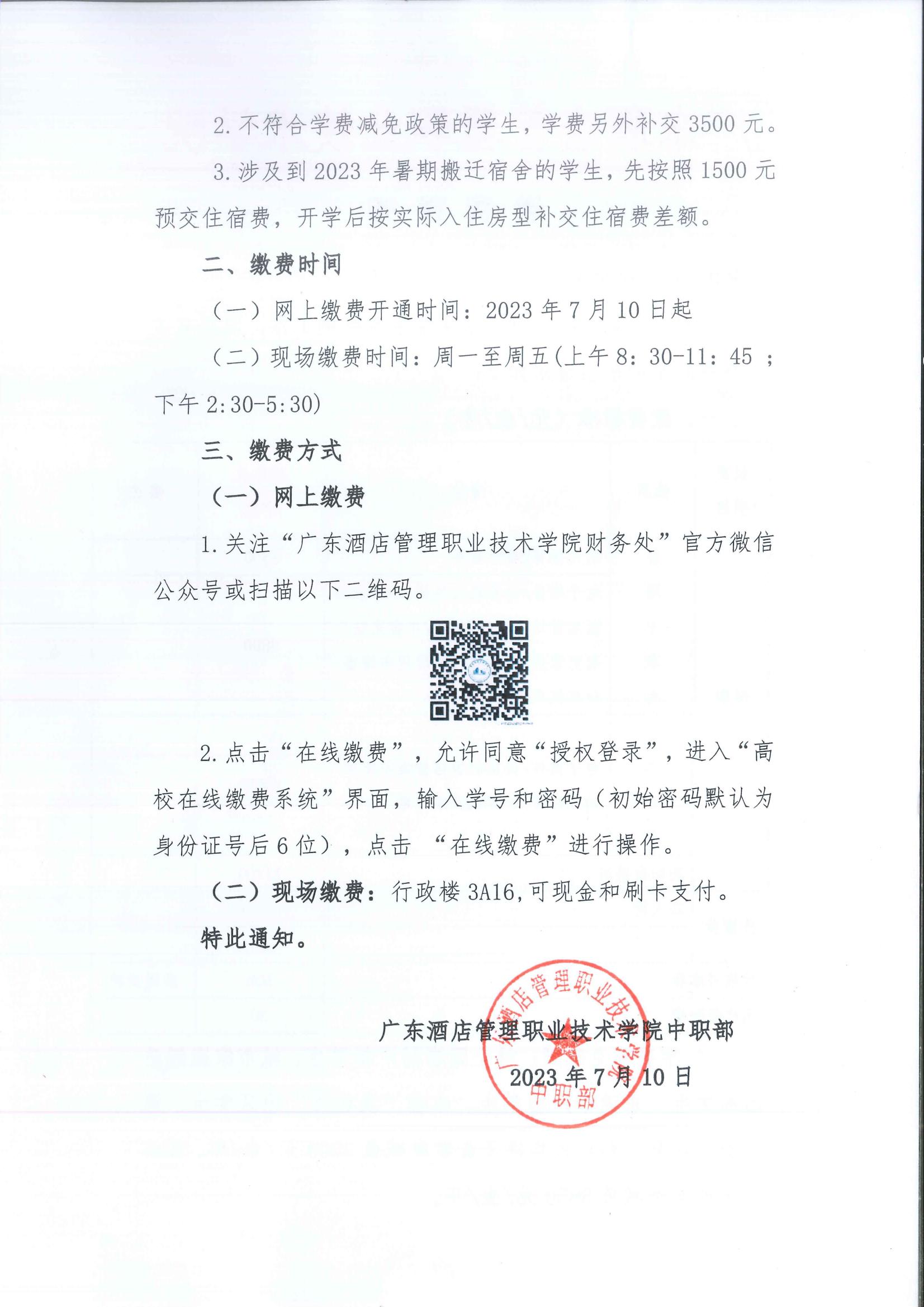 广东酒店管理职业技术学院中职部2021级缴费通知